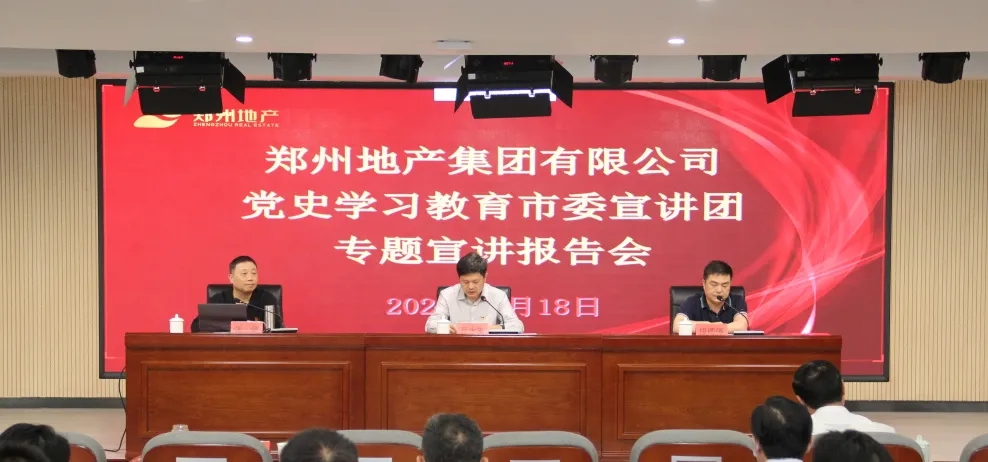 為持續(xù)推進(jìn)黨史學(xué)習(xí)教育走深走實(shí),5月18日上午,鄭州市委宣講團(tuán)走進(jìn)鄭州地產(chǎn)集團(tuán),在集團(tuán)301多功能廳開(kāi)展黨史學(xué)習(xí)教育專題宣講報(bào)告會(huì)。報(bào)告會(huì)由鄭州市委宣講團(tuán)成員、鄭州工程技術(shù)學(xué)院馬克思主義學(xué)院副教授張豪主講,市國(guó)資黨史學(xué)習(xí)教育第二巡回指導(dǎo)組組長(zhǎng)、四級(jí)調(diào)研員段德強(qiáng),指導(dǎo)組成員張?jiān)娪?、陳祥斐到?huì)巡聽(tīng)旁聽(tīng),地產(chǎn)集團(tuán)領(lǐng)導(dǎo)班子、總部全體員工,各子公司支部書記、黨建部門負(fù)責(zé)人等共計(jì)150余人參加現(xiàn)場(chǎng)報(bào)告會(huì),各子公司員工共計(jì)170余人通過(guò)線上直播進(jìn)行觀看,會(huì)議由地產(chǎn)集團(tuán)黨委書記、董事長(zhǎng)萬(wàn)永生主持。