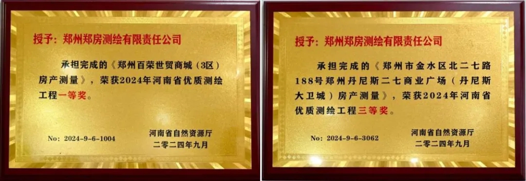 近日,河南省自然資源廳發(fā)布2024年“河南省優(yōu)質測繪工程獎”評選結果,其中,鄭州鄭房測繪有限責任公司獲得“河南省優(yōu)質測繪工程獎”一等獎1項、三等獎1項。