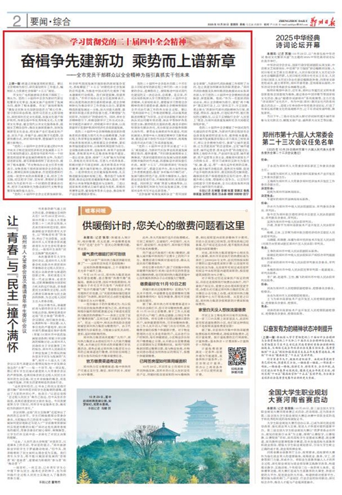 黨的二十屆四中全會(huì)擘畫了中國(guó)式現(xiàn)代化建設(shè)的宏偉藍(lán)圖,為新時(shí)代新征程國(guó)有企業(yè)改革發(fā)展指明前進(jìn)方向、提供根本遵循,鄭州城發(fā)集團(tuán)廣大黨員干部群眾深受鼓舞、倍感振奮。近日,《鄭州日?qǐng)?bào)》《鄭州晚報(bào)》開(kāi)設(shè)了【學(xué)習(xí)貫徹黨的二十屆四中全會(huì)精神】專欄,2025年10月30日,報(bào)道了鄭州城發(fā)集團(tuán)深入學(xué)習(xí)貫徹落實(shí)黨的二十屆四中全會(huì)精神,以全會(huì)精神為指引真抓實(shí)干創(chuàng)未來(lái)。