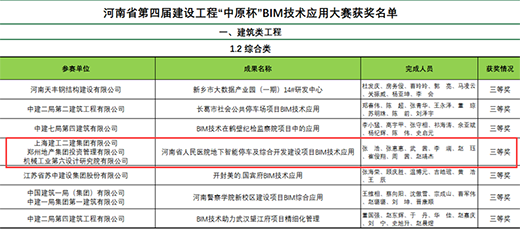 近日,由河南省住建廳指導(dǎo)、河南省建筑業(yè)協(xié)會(huì)主辦的河南省第四屆建設(shè)工程“中原杯”BIM技術(shù)應(yīng)用大賽獲獎(jiǎng)名單揭曉,經(jīng)過(guò)層層評(píng)審,由鄭州地產(chǎn)集團(tuán)投資管理有限公司主導(dǎo),上海建工二建集團(tuán)有限公司、機(jī)械工業(yè)第六設(shè)計(jì)研究院有限公司配合完成申報(bào)的河南省人民醫(yī)院地下智能停車(chē)及綜合開(kāi)發(fā)建設(shè)項(xiàng)目BIM技術(shù)應(yīng)用榮獲建筑類(lèi)綜合成果三等獎(jiǎng)。