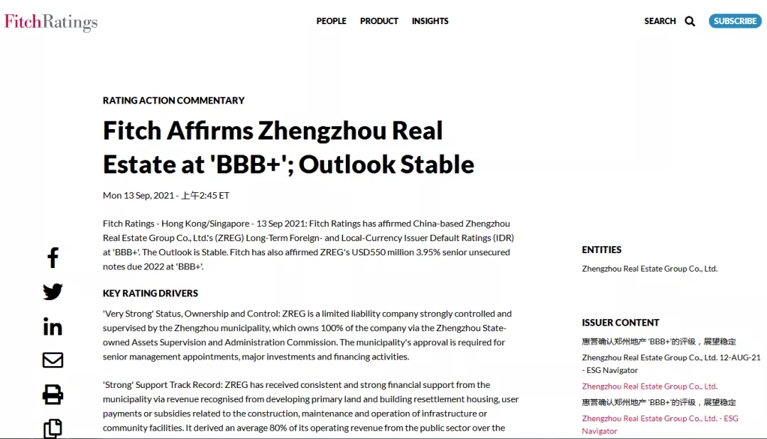 2021年9月13日,惠譽(yù)國際評(píng)級(jí)確認(rèn)鄭州地產(chǎn)集團(tuán)有限公司(簡稱:鄭州地產(chǎn))發(fā)行人評(píng)級(jí)為“BBB+”,展望穩(wěn)定。