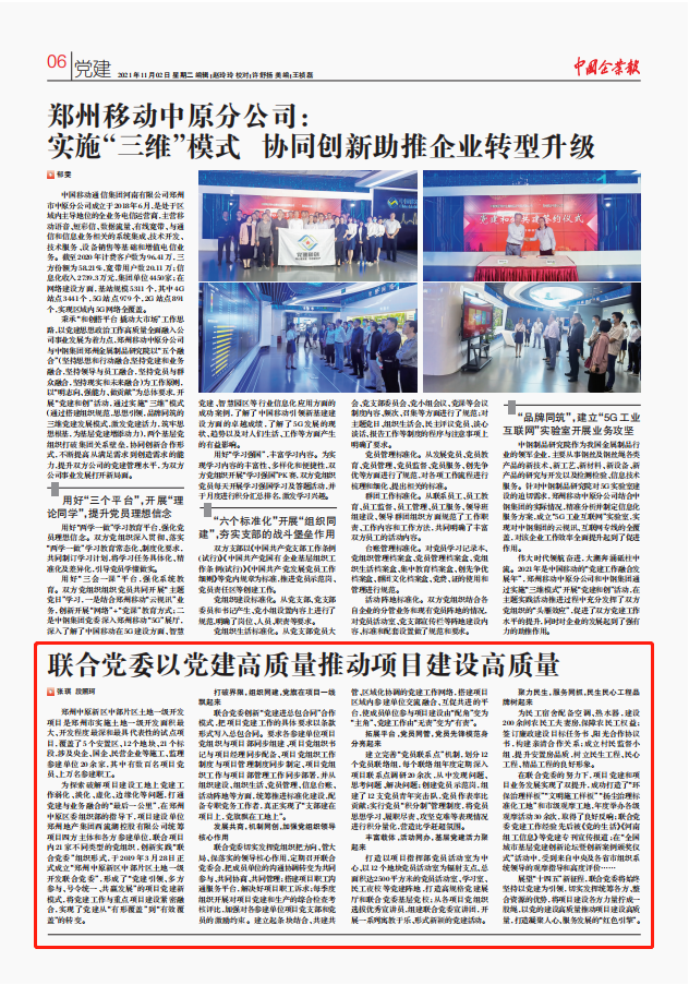 西流湖公司始終堅(jiān)持“抓好黨建就是最大的政績(jī)”,創(chuàng)新“黨建進(jìn)總包合同”合作模式,貫徹落實(shí)“支部建在項(xiàng)目上,黨旗飄在工地上”的工作思路,以中原新區(qū)中部片區(qū)土地一級(jí)開發(fā)聯(lián)合黨委和項(xiàng)目黨支部建設(shè)為抓手,以“12343”黨建工作體系為指引,讓黨的主張、黨的作風(fēng)、黨組織的力量在項(xiàng)目建設(shè)中處處彰顯,充分激發(fā)黨員的先鋒模范作用和黨組織的堅(jiān)強(qiáng)堡壘作用,將黨建轉(zhuǎn)化為生產(chǎn)力,真正實(shí)現(xiàn)黨建促發(fā)展的“紅色引擎”作用。公司黨建工作先進(jìn)經(jīng)驗(yàn)榮登《中國(guó)企業(yè)報(bào)》,意味著公司黨建工作先進(jìn)經(jīng)驗(yàn)對(duì)于全國(guó)企業(yè)黨建具有良好的借鑒意義,標(biāo)志著公司黨建工作及宣傳水平再上新臺(tái)階。